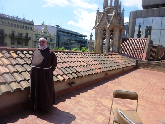 Er staan zelfs twee kerken aan dit centrale deel, tussen Francesc Macià en Glòries. Pare Joan van het Pompeia-convent van de Orde der Kapucijnen, ter hoogte van de Passeig de Gràcia, liet ons van harte binnen, ook al kwamen we onaangekondigd. (Blijft het mooie van Spanje: het is geen land van ver tevoren gemaakte afspraken.) En ook daar ontdek je een immense wereld achter de verder vrij anonieme façade, en mag je vanaf het dak een ongebruikelijke blik op de Diagonal werpen. Plus krijg je een boodschap mee: Pare Joan is tégen het referendum en de verbouwing, niet omdat hij ouderwets zou zijn, maar omdat hij elke woensdag lange rijen mensen voor de deur heeft staan die om eten of geld vragen. Er zijn nu, in tijden van crisis, andere prioriteiten dan smakken geld aan een renovatie uit te geven, aldus de Kapucijn. “Als ik geen geld heb, ga ik toch ook geen Porsche kopen?” zei hij.