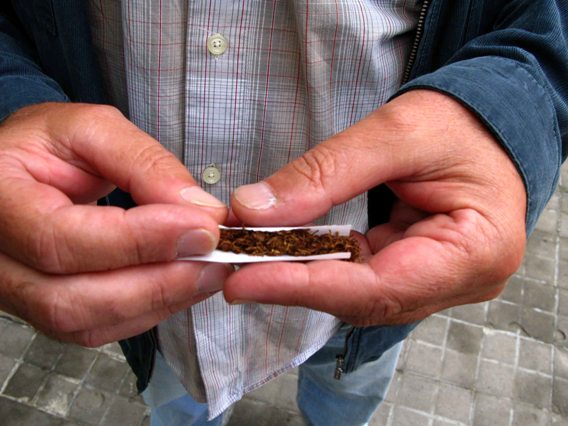Thuis groeide ik op, zonder zelf ooit te roken, met het eeuwige blauwe pakje ‘Van Nelle halfzwaar’ van mijn vader, wiens vingers in een recordtijd een sjekje rolden, terwijl als ik het probeerde er altijd een vreemde toeter ontstond die ik ook nog eens niet goed kon ‘plakken’. Kwestie van ervaring en oefenen. De Spanjaarden hadden de goedkopere shag niet zo nodig, want zij hadden zelf altijd al pakjes sigaretten voor belachelijk lage prijzen.
