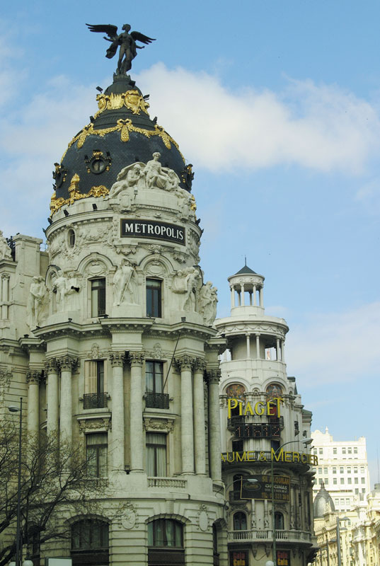 Alle verleden tijden waren vaak beter, waar het de steden betreft. Ook op de Gran Vía. Bijna alle bioscopen zijn verdwenen, de theaters ook. Daarvoor in de plaats: de grote winkelketens die je overal in Spanje, Europa, de wereld inmiddels aantreft. Allemaal hetzelfde. Veel monumentale gebouwen, de meeste, zijn gelukkig bewaard gebleven, veel in die typische gebroken witte kleur van Madrid, zoals het karakteristieke gebouw om de hoek bij nummer 1, het Metrópolis, dat officeel trouwens de ingang aan de Calle Alcalá heeft. Het gebouw was geïnspireerd op de barokke Franse bouwstijl en kwam op de plaats van het eerste gebouw dat gesloopt was, het Edificio del Ataúd, ofwel het gebouw van de doodskist. Niet omdat er een begrafenisondernemer zat, maar omdat het stukje grond zo smal als een doodskist leek. Het was vanaf het begin van de verzekeraar La Unión y el Fénix, die bij zijn vertrek het beeld op het dak, de Fénix, meenam naar het nieuwe hoofdkantoor. De nieuwe eigenaar, verzekeraar Metrópolis, liet er in de jaren zeventig het huidige beeld neerzetten, de Gevleugelde Overwinning genaamd.