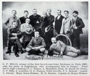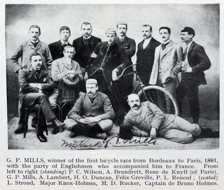 Vermoeid? Een maand later scherpte hij het 24 uursrecord aan door 273 mijl af te leggen, ruim 439 kilometer, om enkele weken later, eind augustus, de End to End op een driewieler te volbrengen. Ook dat record verpulverde hij, door te finishen na 5 dagen en 10 uur. Een uitzonderlijke prestatie, niet alleen omdat het vorige record, van een jaar eerder, liefst 29 uur langzamer was, maar ook omdat zijn driewieler, een Cripper met solide banden, meer dan twintig kilo woog. En zo ging George Pilkington Mills door, jaar na jaar, zijn werk in verschillende fietsfabrieken afwisselend met allerlei recordpogingen over 50 mijl, 100 mijl en vele andere afstanden. Zijn ‘hoge bi-record’ van Land’s End naar John O’Groats zou nooit meer verbeterd worden, en als houder van die aansprekende prestatie was hij op 23 mei 1891 als een van de favorieten verschenen aan de vroege start van de eerste Bordeaux-Parijs, waar verwacht werd dat de winnaar er zo’n twee dagen over zou doen.