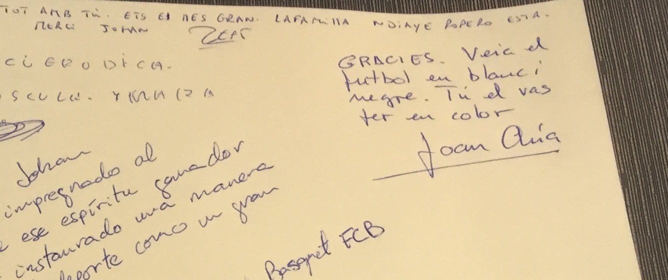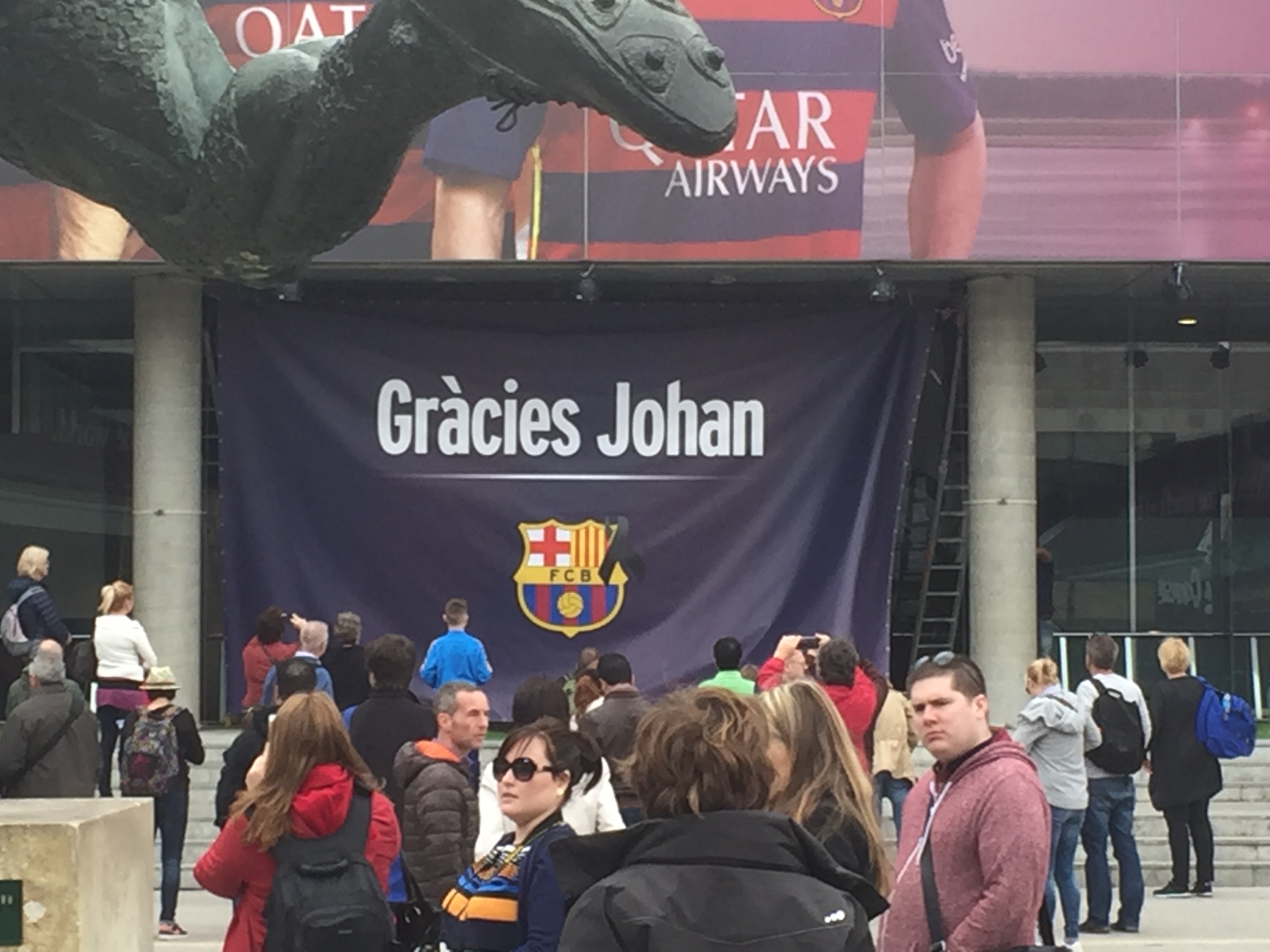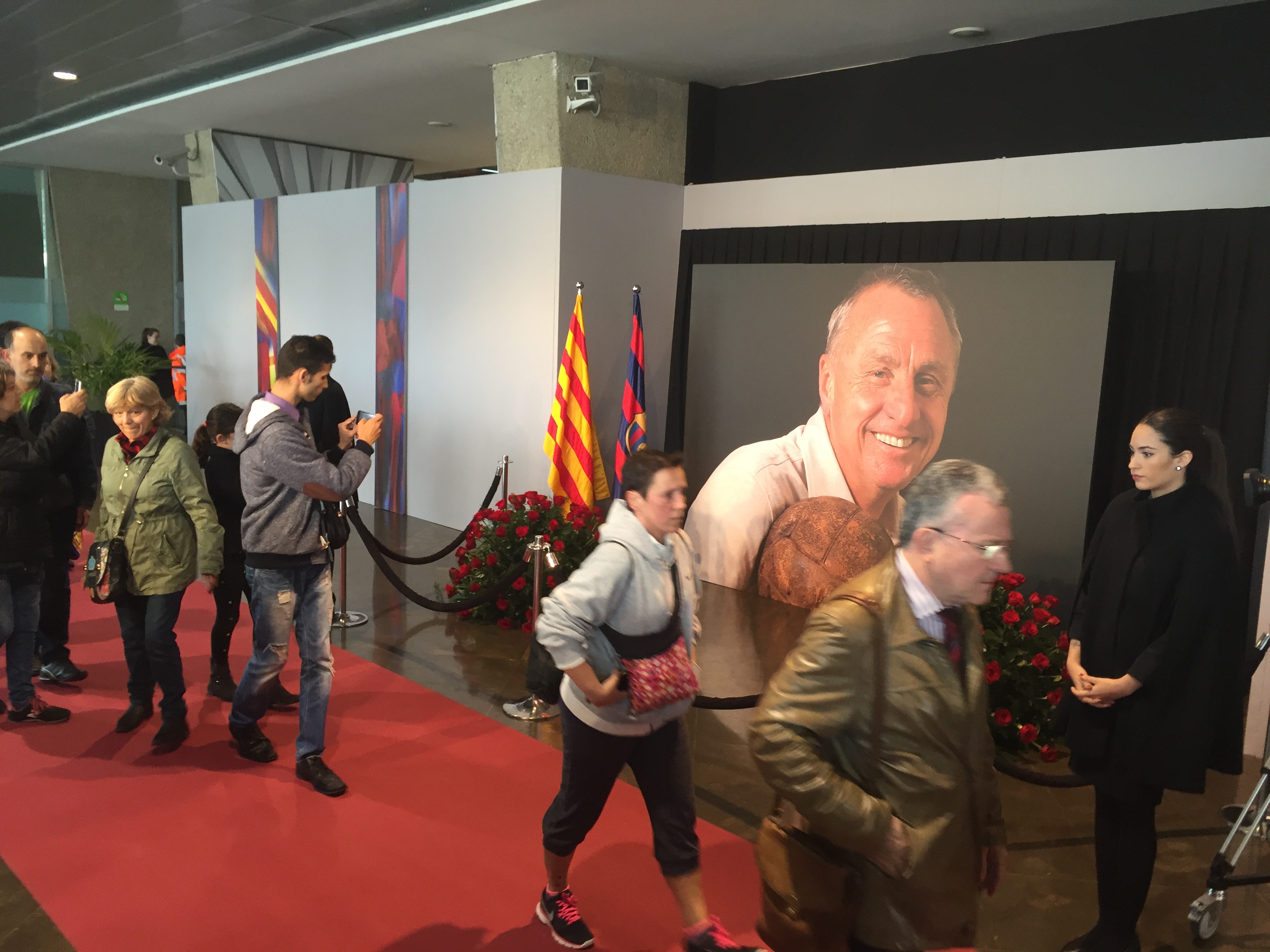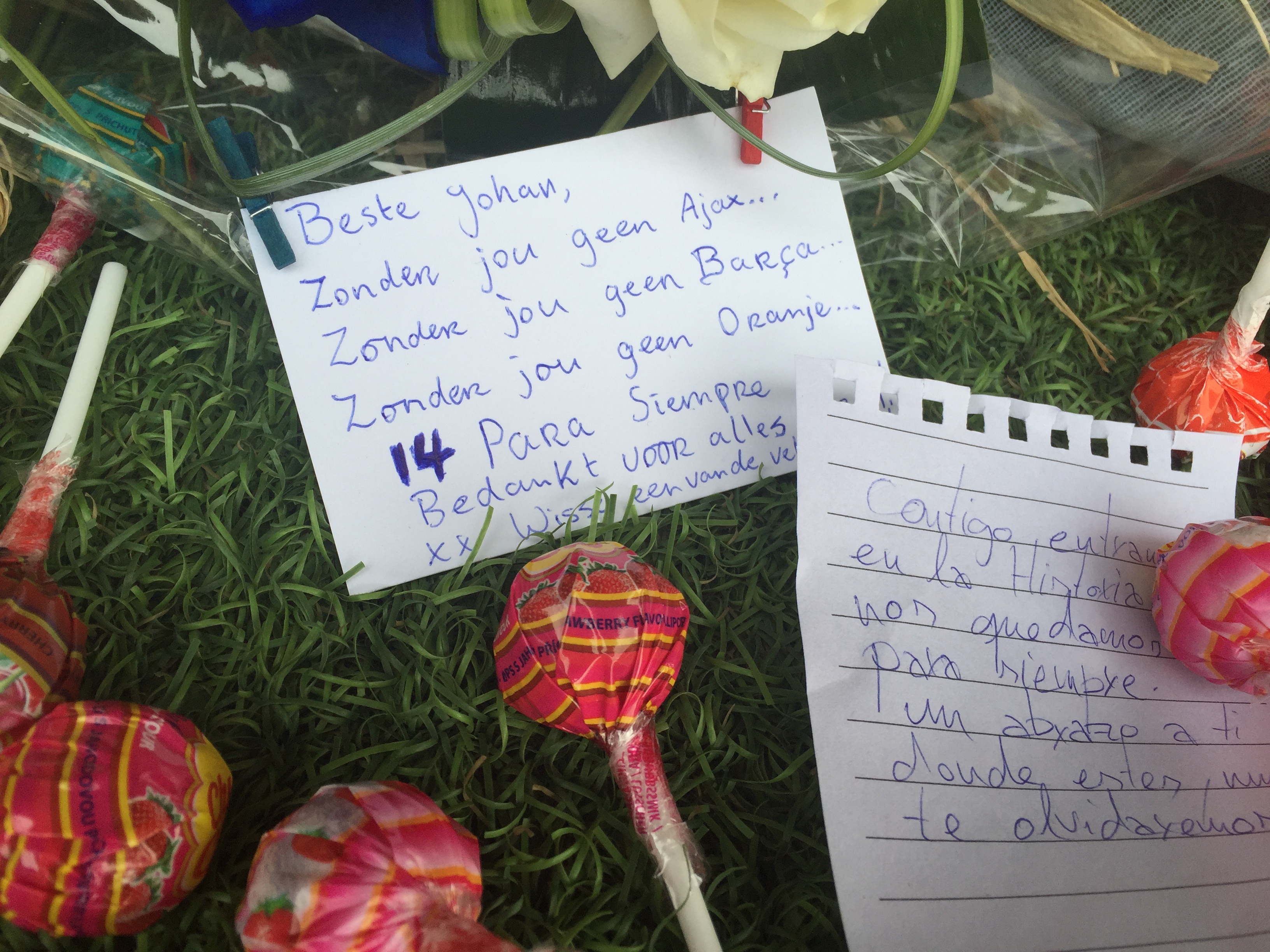 De condoleanceboeken in het Camp Nou zijn luxueus, dik en talrijk. Zestigduizend mensen zetten er in vier dagen een krabbel in. Ik ook. Het is, na twee dagen hectiek, twee dagen van het informeren over de dood van de beroemdste Nederlander aller tijden, even een moment van rust, reflectie, bezinning. Het is zaterdagmorgen. Paasweekeinde, tussen dood en wederopstanding. Ik ga in de rij staan, een kwartier schuifelen, in stilte, voor een stadion dat normaal een kakofonie van geluid is. Ook nu gaat de stroom van duizenden toeristen maar door, velen van een generatie en uit landen waar ze Cruijff niet meer kennen, want de tijd is voorbijgegaan, ook voor hem, en talloze nieuwe helden zijn opgestaan. Vanaf de enorme buitenwand van het Camp Nou kijken Messi en Neymar op de massa neer. In de rij wachtenden voor het register maken mensen foto’s van de bloemenzee, van de lolly’s die er per tientallen zijn neergelegd, de chupa chups van Cruijff. De shirts met opschriften, foto’s… Binnen staat een jongedame in het zwart bij elk van de tien boeken waarin iets geschreven kan worden, en die worden vervangen zodra ze vol zijn. Ik denk even na, en bedank Johan dan voor de achtentwintig jaar samen in Barcelona. Dan valt mijn blik op een kort schrijven boven aan de pagina, van ene Joan. ‘Gràcies. Ik zag het voetbal in zwartwit. Jij maakte er kleur van.’