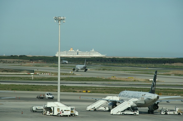 Maar wat je in Barcelona kunt zien, zoals op de bovenste foto, zal je op weinig plaatsen in de wereld zien: vliegtuigen die met een cruisseschip om voorrang vechten.
