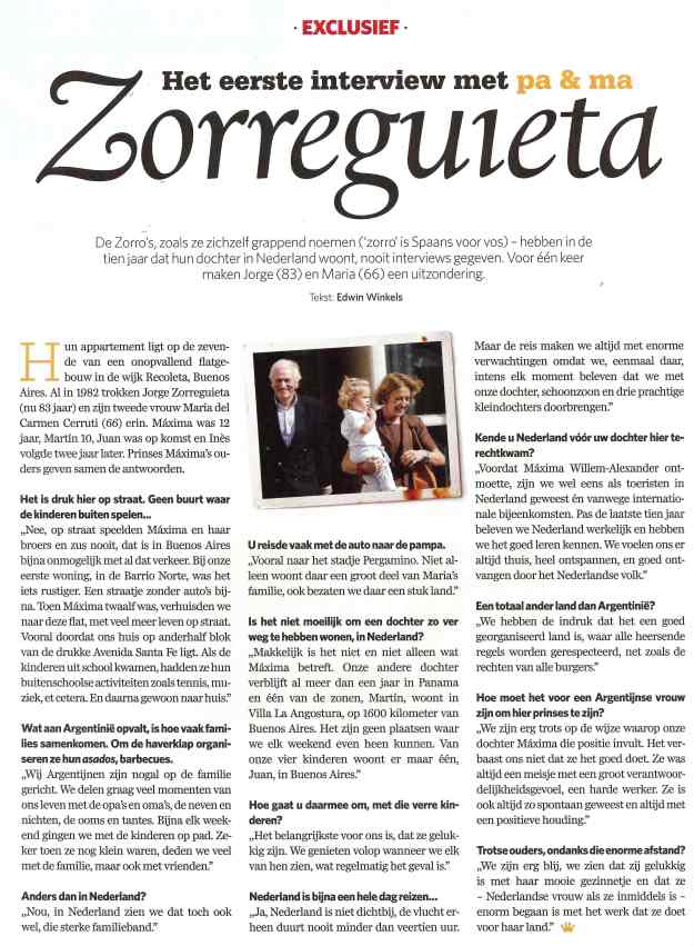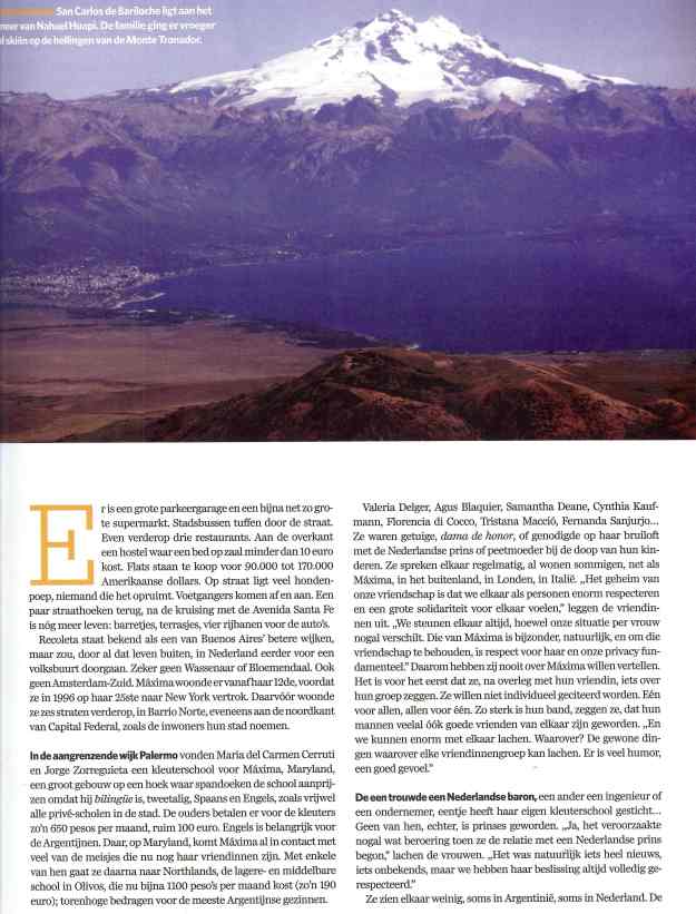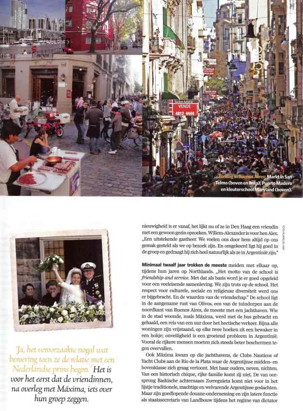 Nu het AD met een officieel persbericht is gekomen (zie hieronder), mag ik zelf ook eindelijk verklappen waarom ik begin april een dikke week in Argentinië was; de concurrentie ligt op de loer, dus zou het niet slim zijn geweest al weken tevoren victorie te kraaien, en zeker niet over een hype als de 40ste verjaardag van de prinses. Al is er de meeste, en terechte, lof voor Erwin Olaf, die Máxima urenlang mocht portretteren in de tuinen van paleis Noordeinde (de sessie duurde het dubbele van de oorspronkelijk geplande tijd), mag ik ook een aandeel in de exclusiviteit van deze glossy, die morgen bij het AD verkrijgbaar is, opeisen: voor het eerst, en voor het laatst, hebben de ouders van Máxima, Jorge en Maria, plus haar broer Martin, plus haar allerbeste jeugdvriendinnen uit Buenos Aires met een journalist willen praten. En zo ontstond er in dat prachtige land een mooi en betrouwbaar verhaal over de jeugd van het Argentijnse burgermeisje tot ze op haar 25ste naar New York vertrok. Zelfs bij de RVD vonden ze het opmerkelijk dat we in zo korte tijd zoveel mensen zo ver kregen om al het ruim 10 jaar durende zwijgen te doorbreken; een bewuste keus trouwens van alle betrokkenen, en niet nadat ze Máxima zelf hadden ingelicht en zij, denk ik, haar goedkeuring had gegeven. Waarschijnlijk had ze zelf ook veel zin in een mooi verjaardagscadeau.