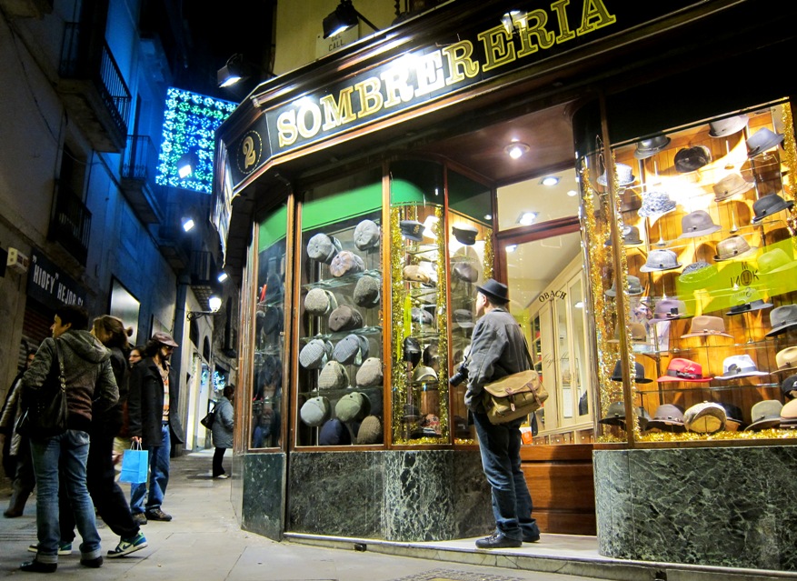 Bijna iedereen blijft er stilstaan, op dit magische voetgangerskruispuntje in de oude stad, waar de straten Boqueria, Banys Nous en Call (el Call is de oude Joodse wijk van Barcelona) elkaar treffen, dichtbij het Plaça de Sant Jaume. Op bijna-winteravonden als deze (hoewel, gisteren om 20 uur, het moment van de foto, was het nog 15 graden) geeft het kunstlicht van Sombrería Obach de hoek én de etalage een onweerstaanbaar panorama. Een heuse hoedenwinkel, deze weken stampvol omdat de kou een beetje gekomen is en omdat een hoed of pet een uitstekend kado-artikel blijkt te zijn. Én omdat, heb ik de indruk, er meer én jongere kale of volledig kaalgeschoren mannen dan vroeger zijn…