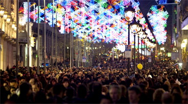 In Nederland kun je, net na Nieuwjaar, een beetje bijkomen van de december-gekte, die begon met Sinterklaas. Hier begint de absolute koopdwaasheid nu pas, in een zich opeenvolgende reeks van dolle dagen. Morgenavond, 5 januari, is er overal de intocht van de Drie Koningen, de mannen die in Spanje, in plaats van de ‘Spaanse’ Sinterklaas, de kinderen met kadootjes verblijden. En natuurlijk kopen de meeste mensen die presentjes in de allerlaatste dagen. Dus ziet een koopzondag 3 januari rond zeven uur ’s avonds er uit als op de foto hierboven, een mensenzee op de Portal del Àngel van Barcelona.