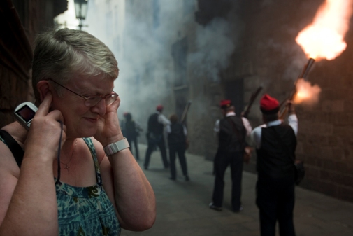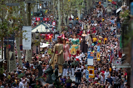 Maar toch: verder was het redelijk pais en vree in de stad. Vier dagen en nachten feest en liefst 1,7 miljoen mensen op pad voor allerlei gratis evenementen (concerten, circus, theater, castellers en de voor toeristen verbijsterende maar tegelijk aantrekkelijke correfoc, de vuurrijke optocht van duivels en draken. (Tip voor als je eens naar de stadsfeesten van Barcelona of andere Catalaanse dorpsfeesten komt: voor de correfoc zijn lange mouwen en een hoedje van stro of dikke capuchon, een zonnebril en eventueel een zakdoek voor de mond noodzakelijk om de vonkenregen zonder pijnlijke brandwondjes van Lucifer te overleven.)