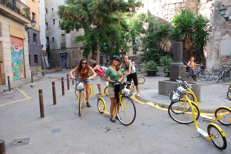 De bloeiende toerisme-industrie kon natuurlijk niet achterblijven bij de populariteit van het fietsen, met enkele Nederlanders, vanzelfsprekend bijna, als voorlopers. Inmiddels zijn er tientallen bedrijfjes die fietstochten door Barcelona organiseren of die de fietsen verhuren, zonder gids. Journalist Eric Castien was met zijn BajaBikes één van de eersten. De fietsen voor zijn tochten betrekt hij bij een andere Nederlander, oud-antiquair Ron van Melick, bij één van diens vier filialen van BudgetBikes (6). De oranje fietsen zijn voortdurend in het stadsbeeld te zien. Kleiner van schaal is, óók in Gràcia, het Cruising Barcelona (7) van Mahrou Raisani en Dirk Dijkhuis, die op hun opvallende beachcruisers ook ‘privétochten’ op maat organiseren. Nóg een Nederlander, Victor de Koning, combineert met zijn BarnaTravelBarnaTravel (8) kleine fietstochten met verhuur van appartementen; een goed alternatief voor gezinnen die niet in een hotel willen overnachten.