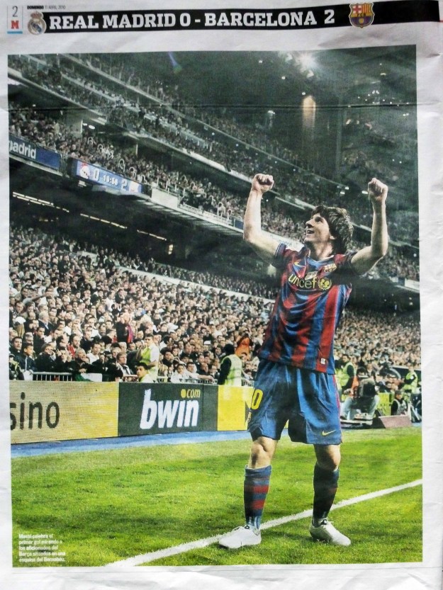 Nog eentje dan, de laatste over het wonderkind voorlopig. Messi. Natuurlijk hadden wij het hier al een jaar geleden al over hem, ver vóór de hype van afgelopen week. Toen ook een prachtfoto, Messi in het Bernabéu. Sportkrant Marca doet er vandaag nog een schepje bovenop: de kleine Messi, bijgenaamd De Vlo, helemaal alleen voor de steilste tribunes ter wereld, die zo hoog reiken dat de voetballer op het veld (noch de fotograaf) de hemel bijna niet ziet.