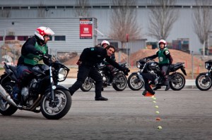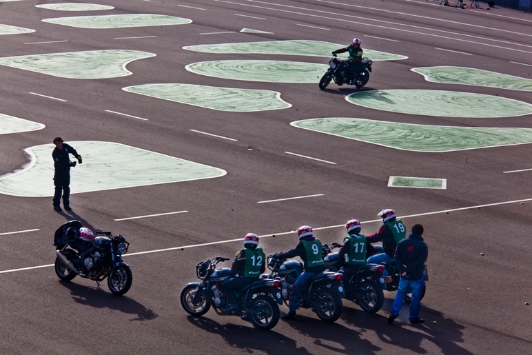 Hier rijd ik, rondjes draaiend op een Honda 650, wat niet zo makkelijk is als het lijkt als je al bijna 30 jaar niet meer op de motor hebt gezeten. Maar ook voor de andere deelnemers aan de cursus, mannen die wél regelmatig rijden, waren sommige proeven der bekwaamheid niet eenvoudig te volbrengen. Het bleek het aardige te zijn van de eendaagse cursus ‘veilig rijden’ die we kregen op het terrein van Honda, in Santa Perpètua de Mogoda, een industrieel voorstadje van Barcelona: veel mensen blijken al jaren ‘verkeerd’ te rijden op de motor en werden daarop voortdurend gecorrigeerd. De meest voorkomende fout: motorrijders kijken niet ver genoeg vooruit, dus niet naar het einde van een bocht maar slechts naar het begin ervan… Te veel het hoofd omlaag, in plaats van trots omhoog.
