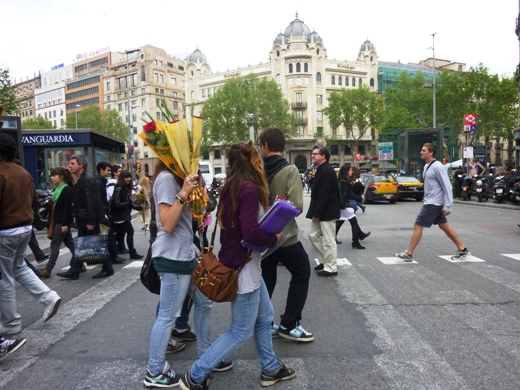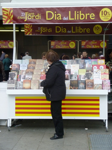 Je moet op een blog niet in herhalingen vallen, maar ook al schreef ik vorig jaar al over de dag van vandaag, Sant Jordi blíjft de moeite waard om er enkele woorden aan te wijden. Het is weer een gekkenhuis in Barcelona, over de Rambla lopen is nog veel minder een pretje dan het normaal al is, maar als je een beetje buiten de grootste drukte blijft, is de 23ste april een dag om van te genieten. Ik geniet vooral van de aanblik: bijna elke vrouw op straat loopt met een roos, gekregen van haar geliefde, vader, broer, collega of gewoon een vriend. Een vrouw zónder roos ga je bijna zielig vinden en zelfs de toeristen blijken niet aan de koorts te ontkomen en kopen voor 3 tot 5 euro zo’n roos. Het ándere cadeau wat bij deze dag hoort, een boek, wordt voor hen wat moeilijker, want bijna alles wat te koop wordt aangeboden is in het Spaans en Catalaans.