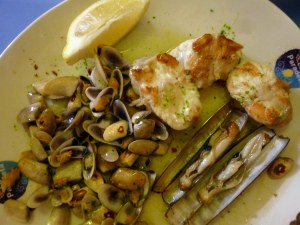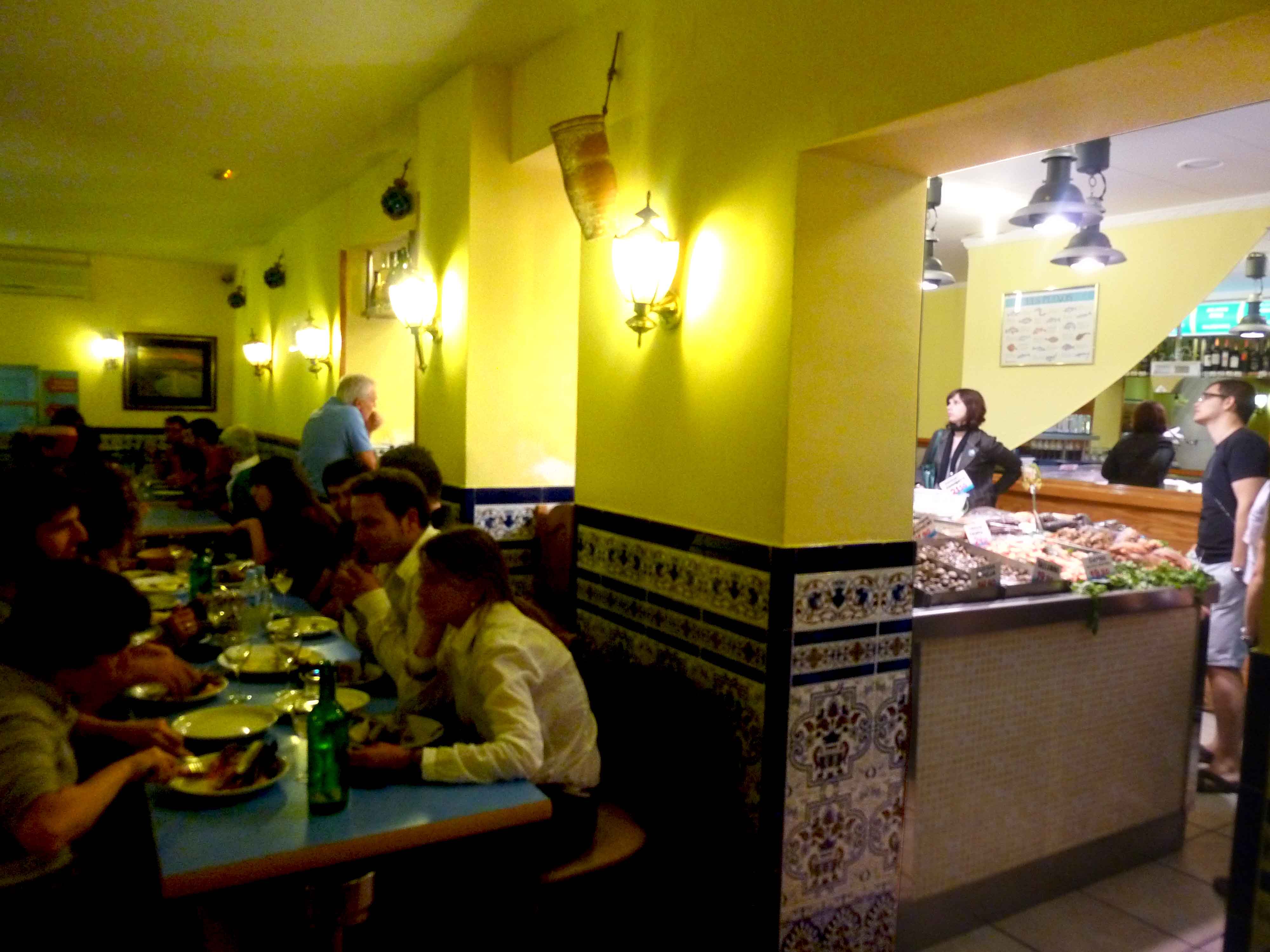 De eerste Paradeta moet alweer bijna tien jaar geleden zijn geopend in de Born. Het concept is doodeenvoudig: bij binnenkomst (na eerst geduldig in de rij te hebben gestaan, deze tenten zijn populair) kies je uit welke heerlijkheden ze voor je moeten bereiden. Héél, heel erg veel keus is er niet, maar je kunt per gerecht ook voor verschillende bereidingswijzen kiezen: de schelpdieren als onovertroffen tallarines en almejas a la plancha (van de grill) of a la marinera (in een beetje witte wijn), de garnalen, camarlans en navajas (scheermessen) natuurlijk van die bakplaat in wat olie met knoflook en peterselie en de drie soorten inktvissen en de rape (zeeduivel) ook van de grillplaat of a la andaluza , een beetje in de meel gewenteld en dan gefrituurd. Je gaat vast aan tafel zitten en de koks roepen je bij een loket zodra ze de gerechten voor je bereid hebben. Je betaalt wat je bestelt, dus puur op gewicht. Het verraderlijke is dat heel veel mensen eigenlijk te veel eten bestellen, want eigenlijk willen ze van alles wat.
