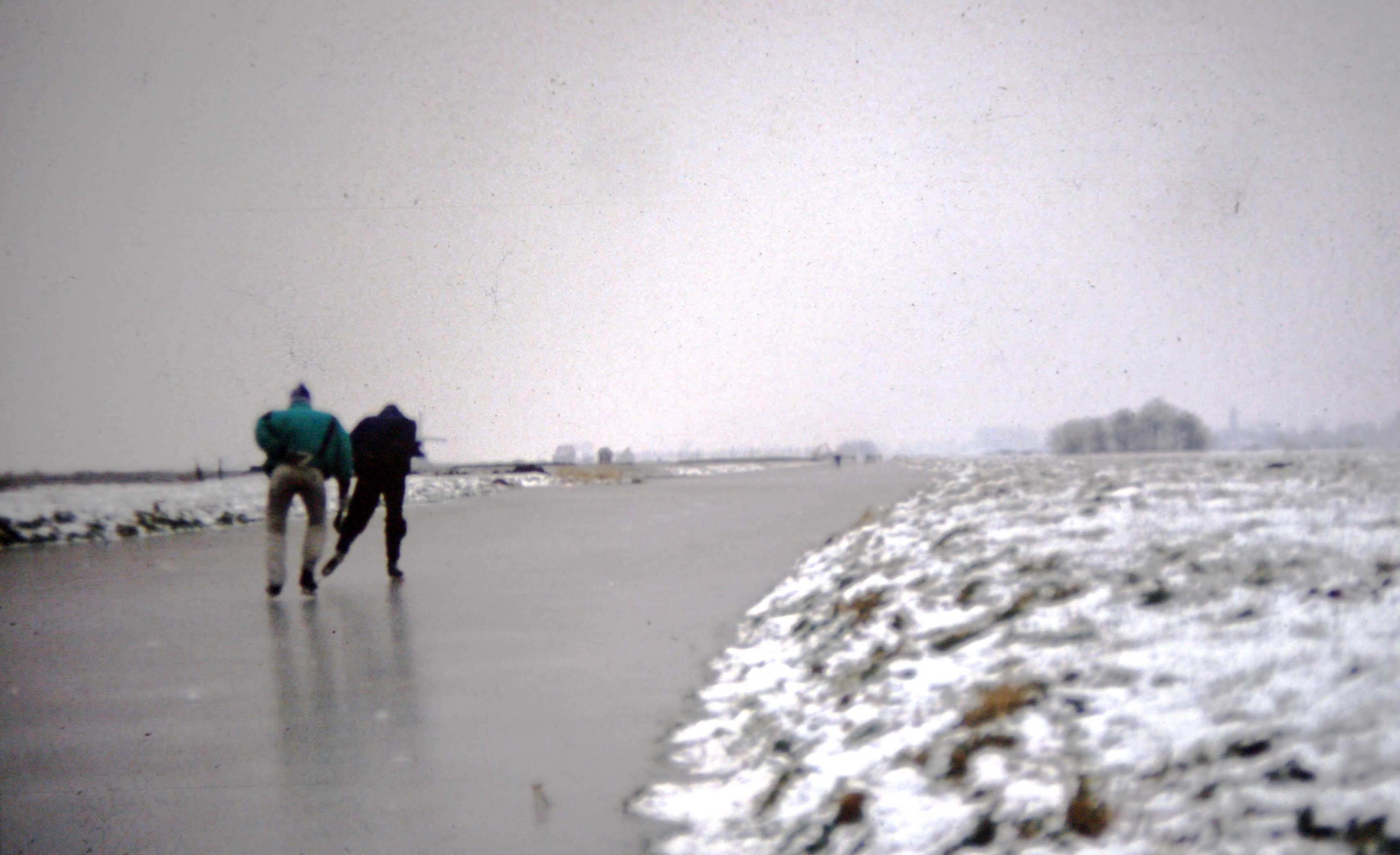 Die dag dus, dat je binnen moest blijven, gingen we natuurlijk schaatsen. De namen in de buurt van Vlist komen ineens weer bekend voor wanneer ik ze op de kaart zie: Haastrecht, Vlist, Schoonhoven, Bergambacht, Stolwijk en weer terug. De wind tegen, op de foto boven goed te voelen, was dodelijk, ijskoud. Dát was de chillfactor waar ze het over hadden, kou waartegen je je nauwelijks kon beschermen. De vaart was, zo is ook goed te zien, spiegelglad maar ook helemaal leeg; nauwelijks gekken die zich op het ijs waagden. Een paar bevroren ballen, dat moest je er maar voor over hebben. En de schade was niet blijvend, is wel gebleken.