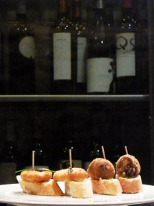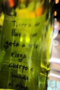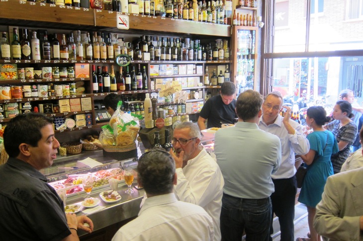 Er is, natuurlijk, vrijwel niets veranderd. Is ook geen ruimte voor, met twee tafeltjes om aan te staan, een bar en een soort tweede, smalle bar aan de andere kant. Twintig, 25 man, hooguit, kunnen ze er kwijt, dus het kan wel eens dringen of wachten zijn. Maar dan heb je ook wat, van raciones (bordjes) van tapas tot de montaditos (heerlijke dingen op een minuscuul broodje, zoals de tonijn met zeeëgel) en de conservas (hapjes uit blik, en dat moet je lekker vinden; de chipirones vielen een beetje tegen). En dat alles overgoten met één van de honderden verschillende wijnen die je er kunt krijgen voor prijzen die soms zelfs ónder die van de supermarkten liggen; het zijn in ieder geval geen restaurantprijzen. Wij kozen op een warme middag – en het blíjft 28 graden en zonnig, deze week! – natuurlijk voor een albariño, met een mooie tekst over Galicië op de binnenkant van het etiket: Tierra de lluvia que gota a gota riega el cuerpo e inunda el alma (land van regen die druppel na druppel het lichaam besprenkelt en de ziel overstroomt).