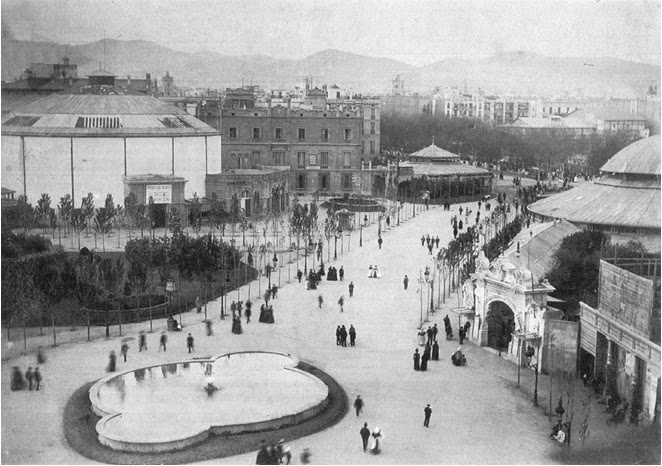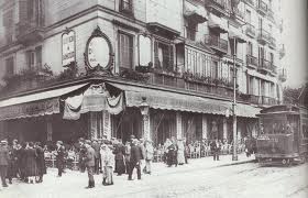 Dat is wel eens anders geweest. Begin vorige eeuw was het Plaça de Catalunya zo’n Parijs-achtig plein waar allemaal grand café’s met hun terrassen talrijke klandizie trokken. De eerste was toevallig eentje precies op de plaats waar nu de ijsbaan komt, het Gran Café del Siglo XIX, in 1888 geopend ter gelegenheid van de Wereldtentoonstelling. De grote ‘kiosk’, hier midden, achter op de foto, kreeg de bijnaam La Pajarera, de vogelkooi.